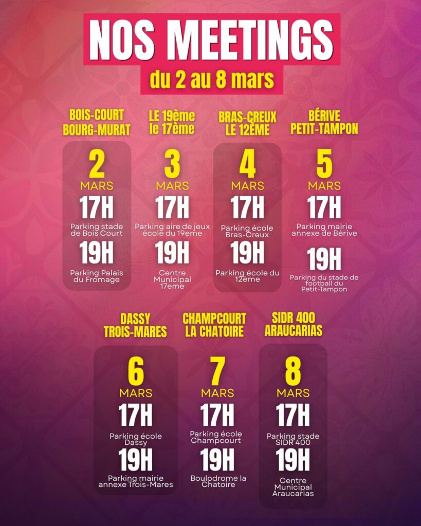 Tous les jours, du 2 au 13 mars, nous organiserons des meetings et nous viendrons dans les quartiers vous rencontrer.